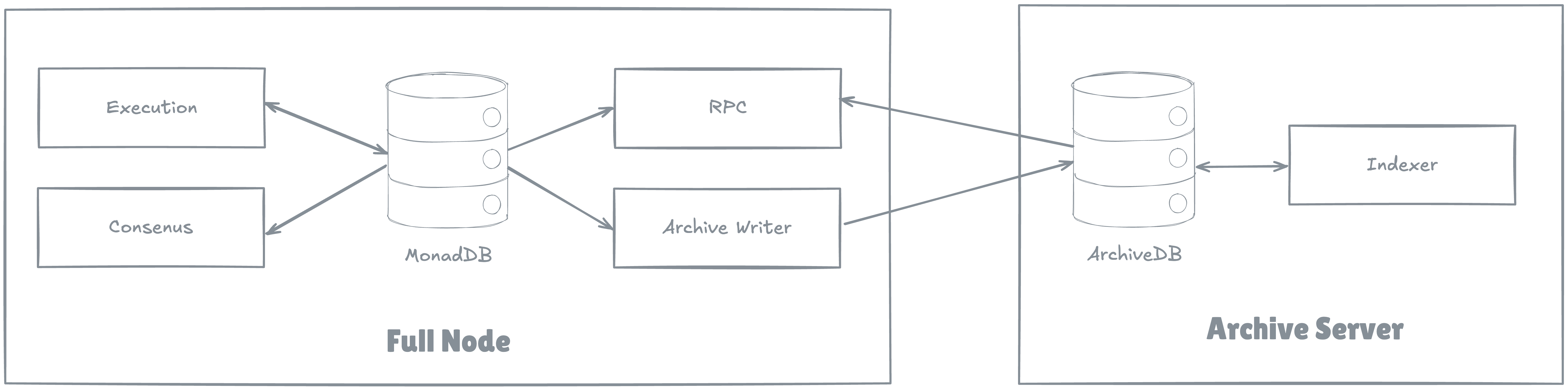 Full nodes and validators can be configured to use ArchiveDB as a source of historical data when that data is unavailable in their local MonadDB.